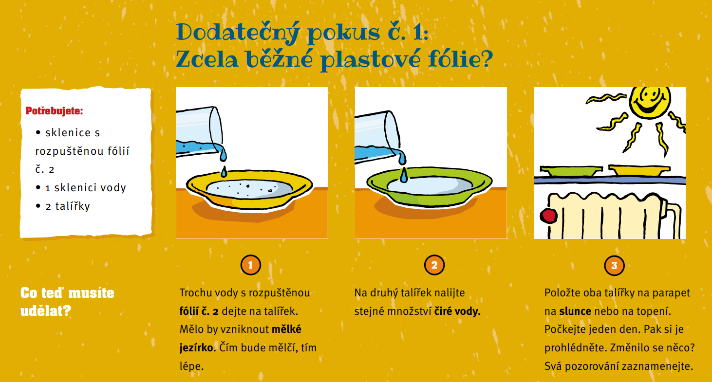 Vzhledem k tomu, že všechny fólie jsou průhledné a bezbarvé, může snadno dojít k jejich záměně. Doporučujeme rozdělovat role s fóliemi postupně a ihned po odstřižení potřebných kousků nechat děti, aby je popsaly tak, jak je uvedeno v návodu k pokusu